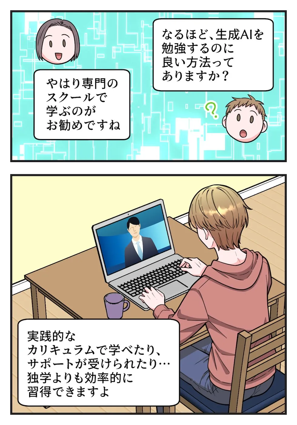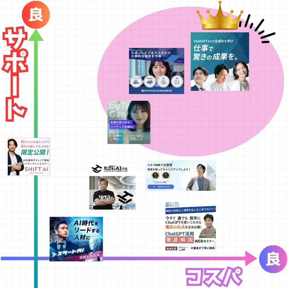 ご自身の目的に合ったサービスや内容があるかどうかは、生成AIのスクール選びでとっても重要なポイントです。