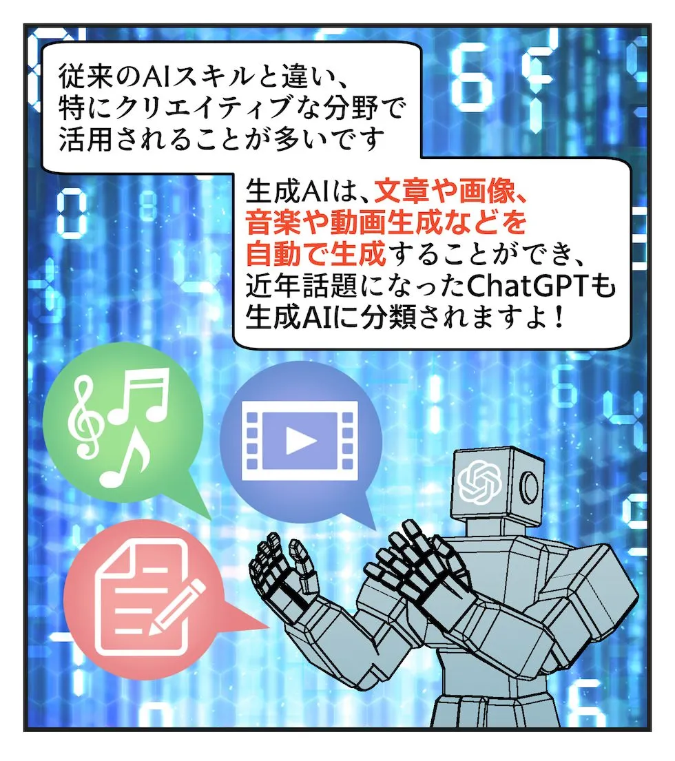 生成AIスキルは、文章生成から画像生成、動画、音楽と幅広い為、専門スキルを学べるスクールを選びましょう。