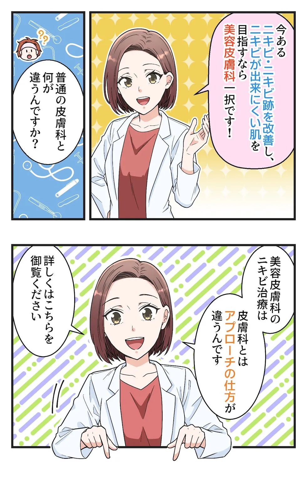 | 特徴 | 今あるニキビや跡を改善して、ニキビが出来にくい肌質へ根本治療 | 今あるニキビを治療するが、ニキビ跡や肌質改善は難しい | ニキビの予防 |