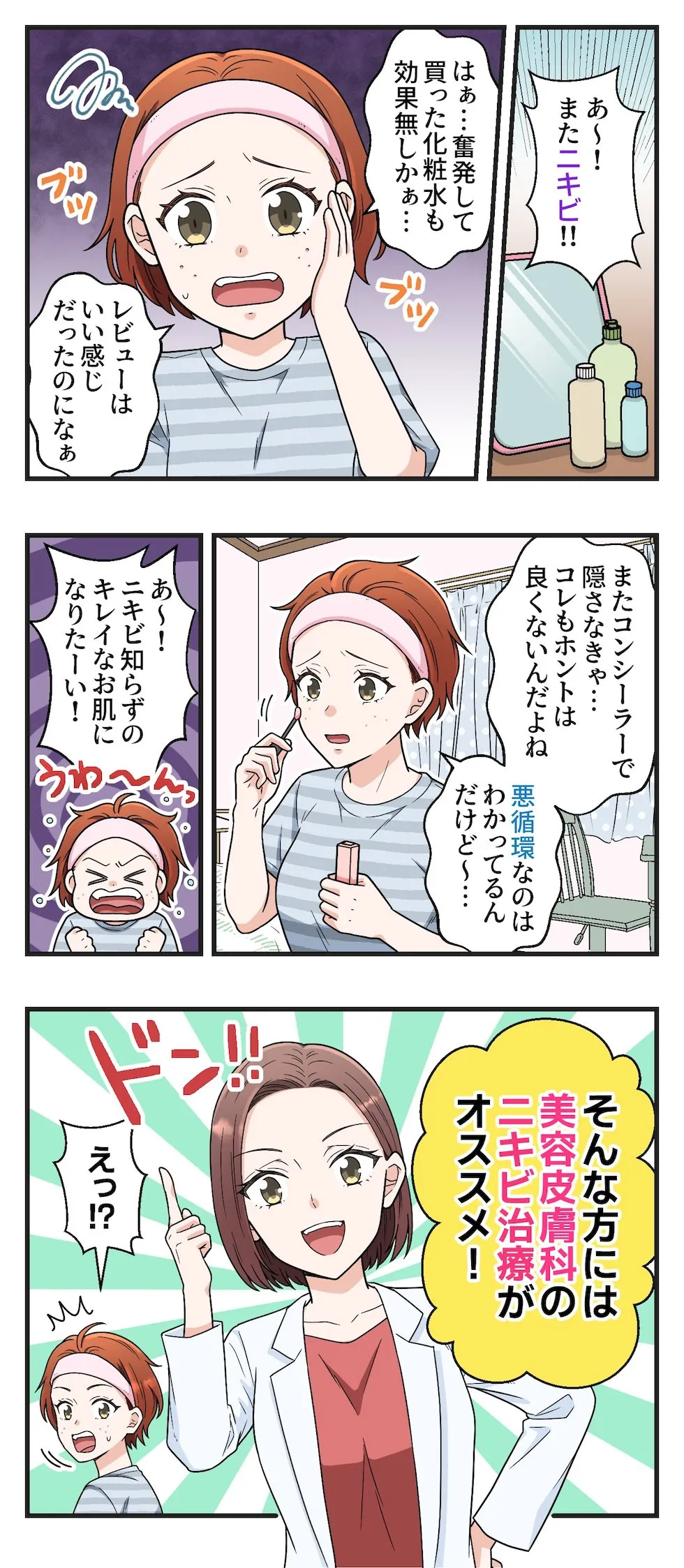 市販薬や皮膚科で改善しなかったニキビが、美容皮膚科の治療で落ち着きました。